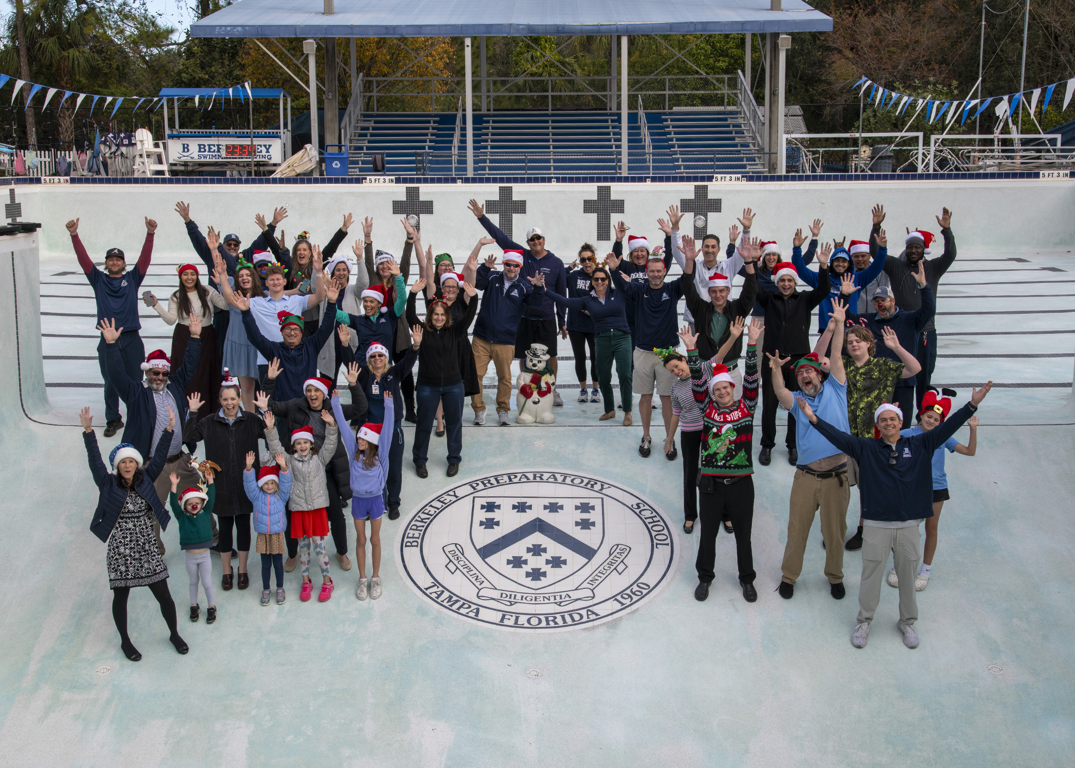 Berkeley faculty and staff posed for a fun photo at the bottom of the Michael G. Cantonis Pool while it was drained for a routine cleaning over Winter Break.