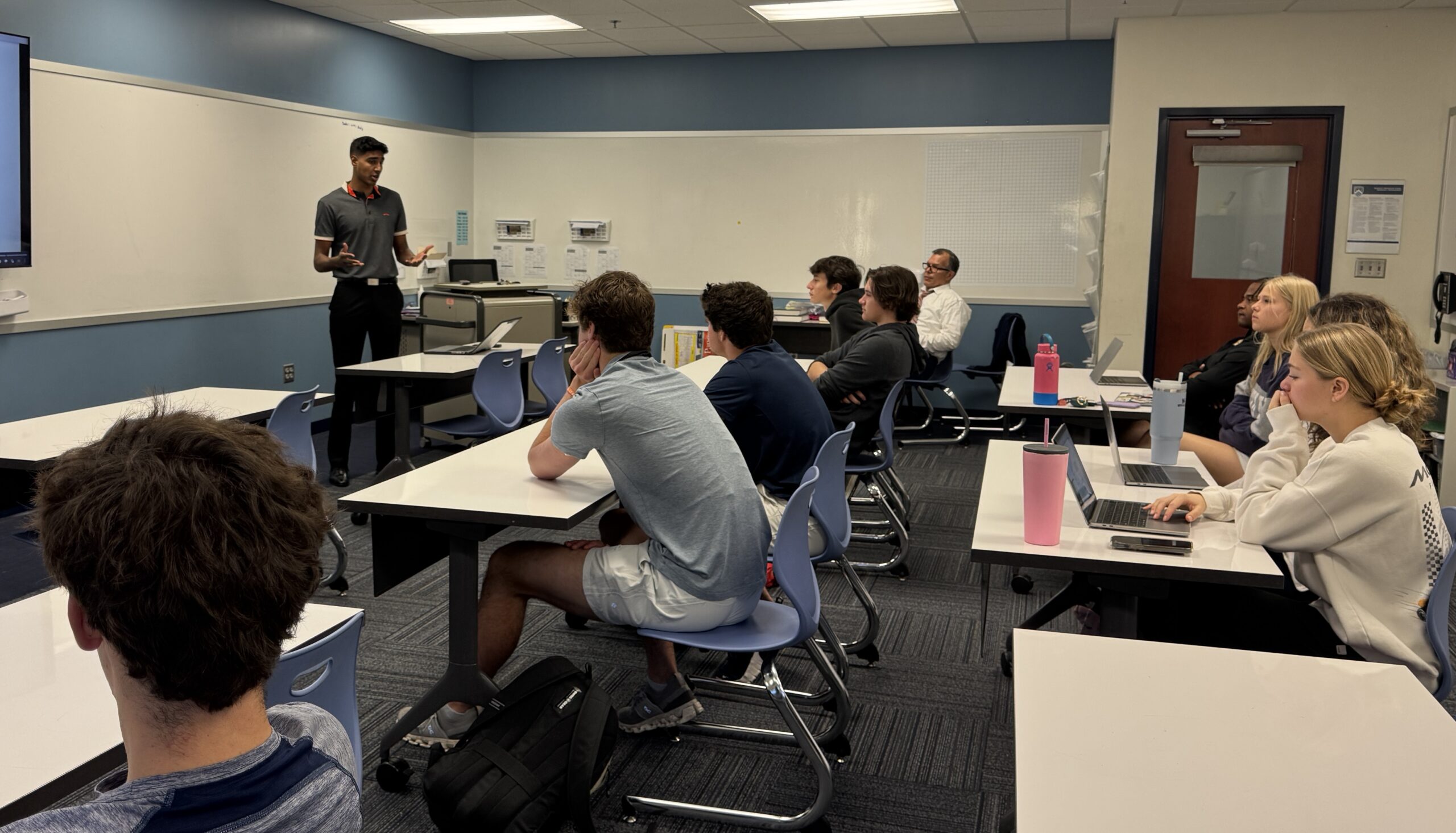 The Lasher Center for Business and Entrepreneurial Studies thanks Rishi Sadanandan ’23, 2024 Buc Ventures winner for his PocketChange startup, for returning to campus recently to share his insights on early-stage investing with students in the Business Fundamentals, Accounting, and Financial Math class. Rishi, currently majoring in Computer Science (AI) and Math at Stanford, continues to inspire our students with his entrepreneurial spirit and commitment to innovation.